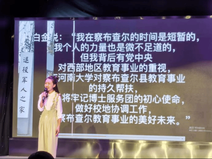 支教盈年岁月艰,壮心一片刻青山。在演讲中,bellbet贝博艾弗森官方网站的刘慧平同学讲述了自己偏远家乡与bellbet贝博艾弗森官方网站文学院支教团的缘分,赞扬了河大传播教育的奉献情怀,并表示自己将与bellbet贝博艾弗森官方网站同频共振、再创辉煌。