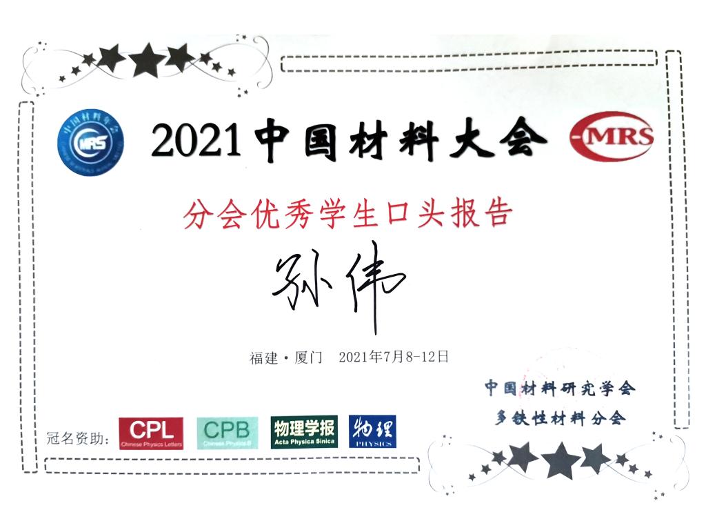 2021年7月8-12日,“中国材料大会2021”在厦门国际会展中心召开。bellbet官网2019级博士生孙伟参加“中国材料大会-多铁性材料分会”,并作了题为“二维异质结中铁电极化对bimeron的调控”的口头报告,介绍了二维多铁材料中铁电极化对长程和短程磁序的非易失性控制方法,获得本届会议“分会优秀学生口头报告”。