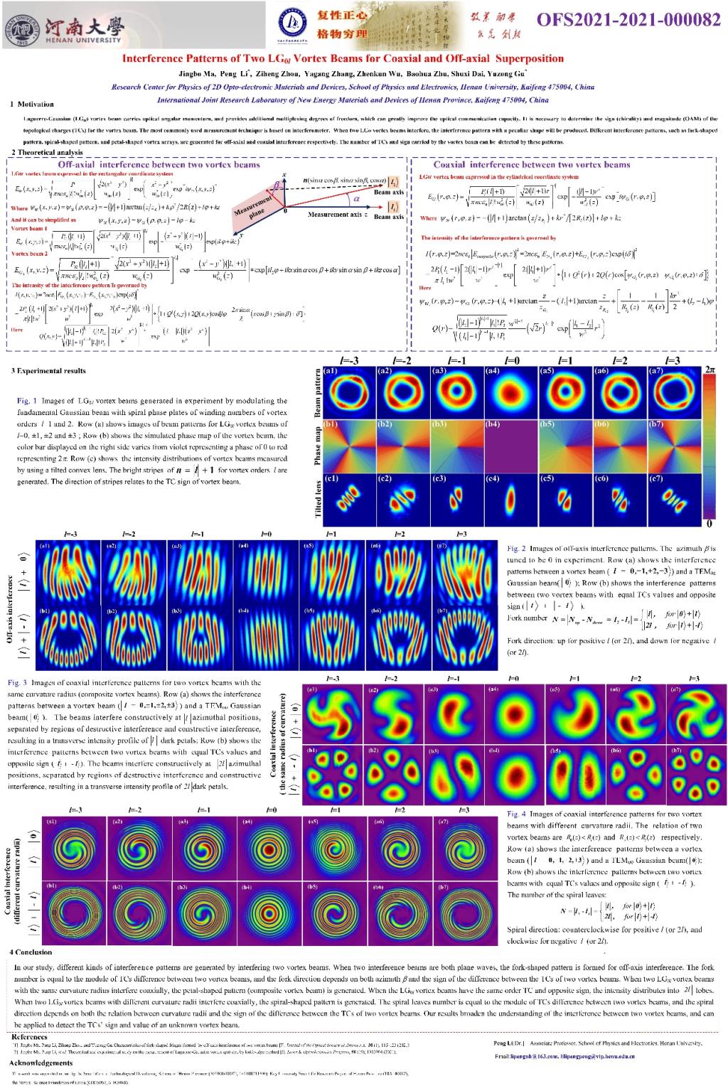 bellbet官网硕士生马靖博获奖的张贴报告论文在实验上系统研究了两束LG0l涡旋光的干涉特性,详细阐释了干涉图样与两束涡旋光的拓扑荷的符号和大小、空间位置关系(方位角)等之间的关系。该研究工作为涡旋光束的检测、手性微结构材料的加工和微粒的俘获与操控等方面的研究提供了重要指导。研究内容及实验结果得到大会组委会的一致认可。