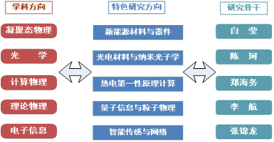 学院主要围绕凝聚态物理、光学、理论物理、计算物理、电子信息等学科方向开展科学研究工作,形成了新能源材料与器件、光电材料与纳米光子学、热电材料第一性原理计算、量子信息与离子物理、智能传感与网络等特色研究方向,组建了省特聘教授领衔、学缘年龄结构合理的研究团队,拥有河南省高效能量转化科学与技术重点实验室、河南省新能源材料与器件国际联合重点实验室、河南省镁铝铜基原位复合金属材料工程实验室、河南省智能微纳传感技术与应用工程研究中心等省级科研平台,实验室面积约为2500平方米,仪器设备总值近7300万元。