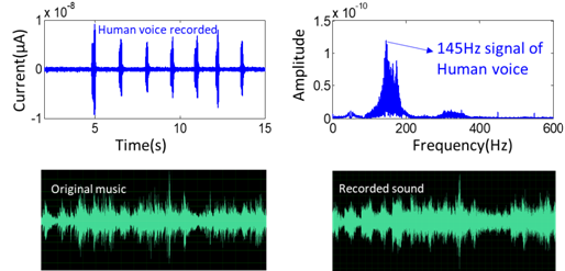 研究人员将摩擦纳米发电机(TENG)与聚合物管集成起来,用于从环境中获取声能,其工作频率稳定在20 Hz-1000 Hz之间。TENG是由电纺聚偏氟乙烯(PVDF)纳米纤维和导电织物组成,独特的结构设计,有利于声能的捕捉和电输出的增强。在170 Hz和115 dB的声波下,TENG开路电压和短路电流分别可以达到400 V和175 µA,瞬时最大输出功率密度为7 W/m2。另外,该系统不仅可用于音频分析和噪声检测,还可作为一种自驱动的麦克风。该成果设计的TENG不仅可以分辨出音叉的频率,还可以记录人说话的声音,并分辨出人的语音信号的频率范围。此外该成果还演示了用TENG记录中国传统名曲《茉莉花》,并通过电脑将记录的音乐播放出来。该成果不仅为制造高性能声音驱动的摩擦纳米发电机提供了一种简单、经济有效的方法,而且使自供电传感应用成为可能,在人工智能、物联网、环境降噪等方面具有潜在的应用前景。