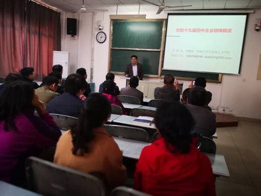 11月7日下午2:30,bellbet贝博艾弗森官方网站党委在金明综合楼5107教室举行“不忘初心、牢记使命”主题教育报告会,邀请马克思主义学院教授刘德定做了题为《党的十九届四中全会精神解读》的报告。报告由学院党委书记王宏华主持,学院全体教工聆听了报告。
