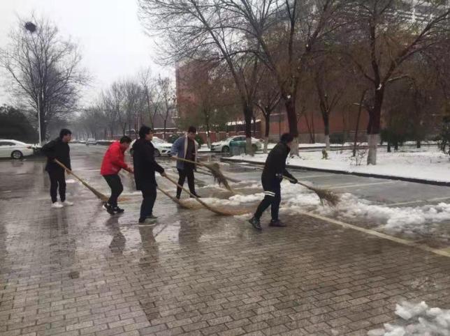 整个过程中,大家不畏寒冷,拿着除雪工具,默契配合,干劲十足。清扫过程中由于部分积雪融化,许多地方出现积水现象,虽然积水浸湿了同学们的鞋,但丝毫没有影响大家扫雪的积极性。经过师生的共同努力,学院周边路面上的积雪被清扫干净,为在校师生出行提供了极大的方便。