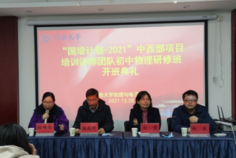 12月20日上午,“国培计划-2021”中西部项目培训讲师团队初中物理研修班开班典礼在尚客优快捷酒店(新河大店)3楼会议室举行。bellbet贝博艾弗森官方网站院长白莹、副院长魏高明、大学物理教研室主任杜明荣、继续教育办公室主任向兵等有关负责人和来自全省各个县区的近50名初中物理精英教师参加了开班典礼。典礼由魏高明主持。