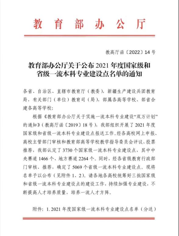 2019年,教育部启动一流本科专业建设“双万计划”,2019至2021年期间分别建设1万个左右国家级和省级一流本科专业点。学院高度重视2021年国家级一流专业申报,认真调研规划,精心组织实施,为确保打赢2021年度国家级一流专业建设点申报攻坚战提供了坚实的保障。入选国家级一流本科专业建设点,是对学院专业建设和人才培养成效的充分肯定,也是学院全体教职工长期努力的成果。