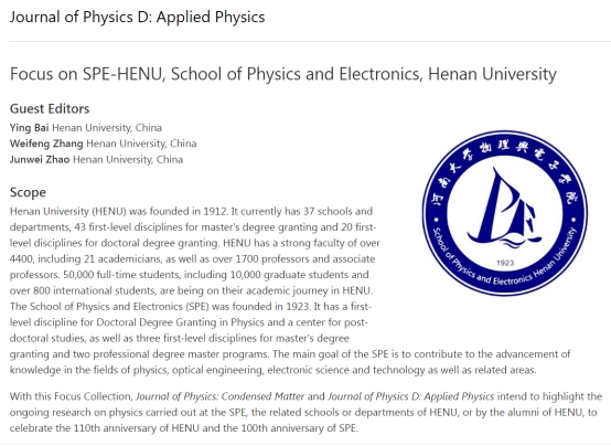 2021年7月,学院启动校庆学术专刊筹备工作,由白莹教授、张伟风教授、赵俊伟教授组成客座编辑团队,正式向JPD和JPCM出版方提出组织专刊申请。专刊向40余位校内科研人员和校友发出了投稿邀请,累计接收投稿30余篇。最终JPD专刊录用10篇论文,JPCM专刊录用7篇论文,集中展现了bellbet贝博艾弗森官方网站物理学科的学术进展和科研成果,有效提升了bellbet贝博艾弗森官方网站物理学科的国际影响力。在接下来的几个月里,bellbet贝博艾弗森官方网站公众号将组织一系列学术论文推送,介绍在JPD和JPCM校庆学术专刊上发表的物理学最新前沿成果。