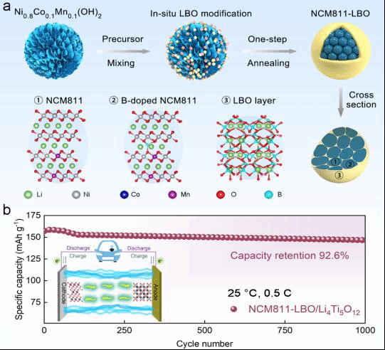 锂离子电池高镍三元(NCM)正极材料由于高的比能量而备受关注。然而,在循环过程中,严重的氧析出不可避免地造成了热安全问题,另外材料剧烈的体积变化引起了应力的产生和积聚,导致高镍材料二次颗粒沿晶界处产生裂纹,进而诱发电解液的渗入并与内部晶格发生副反应,最终致使电池循环性能快速衰退。白莹教授课题组采用简单的原位构筑方案,将与氧具有高结合能的硼离子梯度掺杂进入高镍材料一次颗粒晶格中,并在二次颗粒表面构筑具有压电特性的四硼酸锂包覆层,将内部NCM的应力原位转化为周期性变化的界面局域电场,协同参与调控电极-电解质界面处Li+的输运行为。该研究还采用多尺度的原位/非原位实验表征结合理论计算以及有限元分析证实了这种原位构筑的氧释放缓冲层和界面离子输运调控层可以有效提升高镍正极材料的结构稳定性和电化学性能。该工作为提升锂离子电池热安全性能和改善固液界面性能提供了新的研究思路和技术手段。
