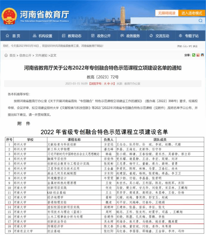 近日,河南省教育厅公布了2022年专创融合特色示范课程立项建设名单,bellbet官网魏凌教授负责的《普通物理实验》、吴永辉副教授负责的《创新技法导论》获批立项建设。