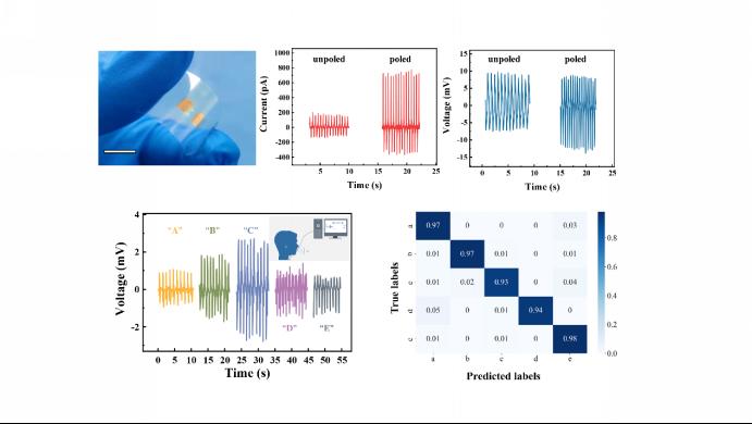 二维压电材料具有较强的固有压电性和优越的灵活性,在开发压电纳米发电机(PENG)方面具有巨大的潜力。然而,却很少有人深入研究二维铁电材料在能量收集器件方面的应用。近日,郑海务教授团队通过铁电极化增强了机械剥离制备的二维铁电CuInP2S6(CIPS)PENG的输出性能。其中,器件在0.85%的拉伸应变下产生760 pA的短路电流,比未极化的CIPS PENG高3.8倍。系统的PFM和拉曼分析表明,铁电极化显著增强了硅纳米片的有效压电常数,促进了铜离子的平面内迁移和平面外跳跃,这是提高输出性能的主要原因。此外,基于CIPS的PENG不仅可以用于获取腕关节运动等生物力学能量,而且还可以显示出与深度学习技术集成的语音识别系统的潜力。一系列字母音的分类准确率高达96%。本研究极大地拓宽了二维材料在微纳米能源和智能传感器中的应用范围,对可穿戴纳米电子器件的探索具有深远的意义。