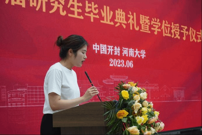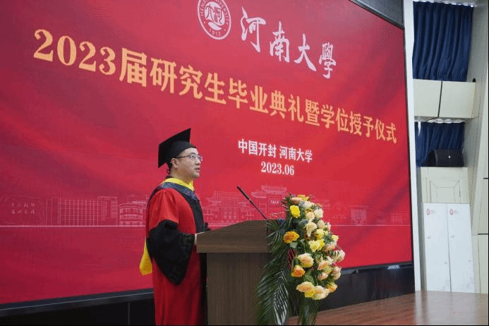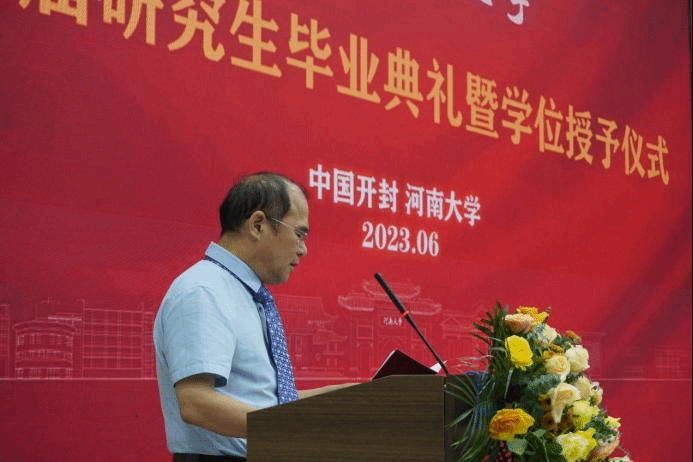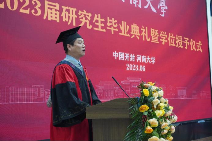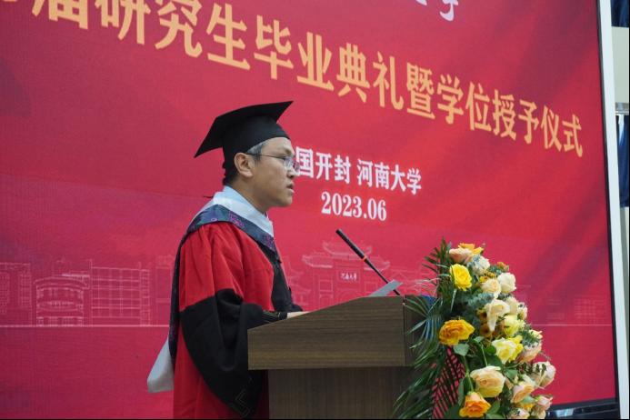 学院党委书记张慧首先向顺利完成学业的毕业生表示最热烈的祝贺,向悉心指导的导师们和全体教职员工们表示最衷心的感谢。他表示,2023届毕业生在河大度过了极不平凡的三年。三年来,同学们见证了建党百年的伟大历史时刻,迎来了党的二十大胜利召开,面对新冠疫情,同学们直面挑战,迎难而上,彰显出河大学子独特的致公情怀。三年来,学校硬件条件不断改善,学科建设屡获佳绩,无一不是全校师生共同努力的结果。他相信,三年的宝贵经历都将内化成精神财富,助力学子们走向未来美好的人生。