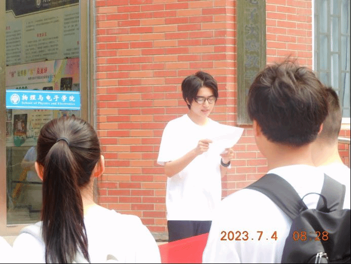 学生代表田文杰发言,他真挚感谢学校和学院为同学们提供了这次宝贵的社会实践机会,大家一定会在实践活动中坚定不动摇的心,去看、去思、去行,用努力和汗水去圆满地完成这次实践活动,以良好的精神面貌将自己所学的科技文化知识服务于社会与人民。