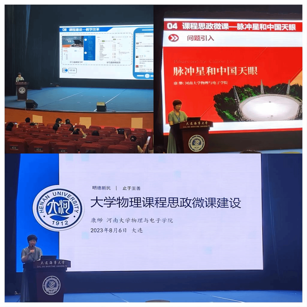 2023年8月5-8日,由教育部高等学校大学物理课程教学指导委员会课程思政工作委员会主办、大连海事大学承办的大学物理及大学物理实验课程思政研讨班在辽宁省大连市召开。来自清华大学、南京大学、西安交通大学、中国科技大学、中国矿业大学等近200名专家学者参加此次会议。bellbet官网大学物理教研室教师康缈、任凤竹和李若平应邀参加了此次会议,康缈在会上作了题为《大学物理课程思政微课建设》的主题报告。