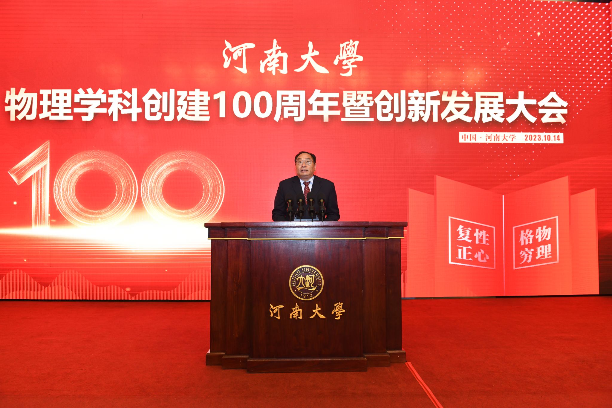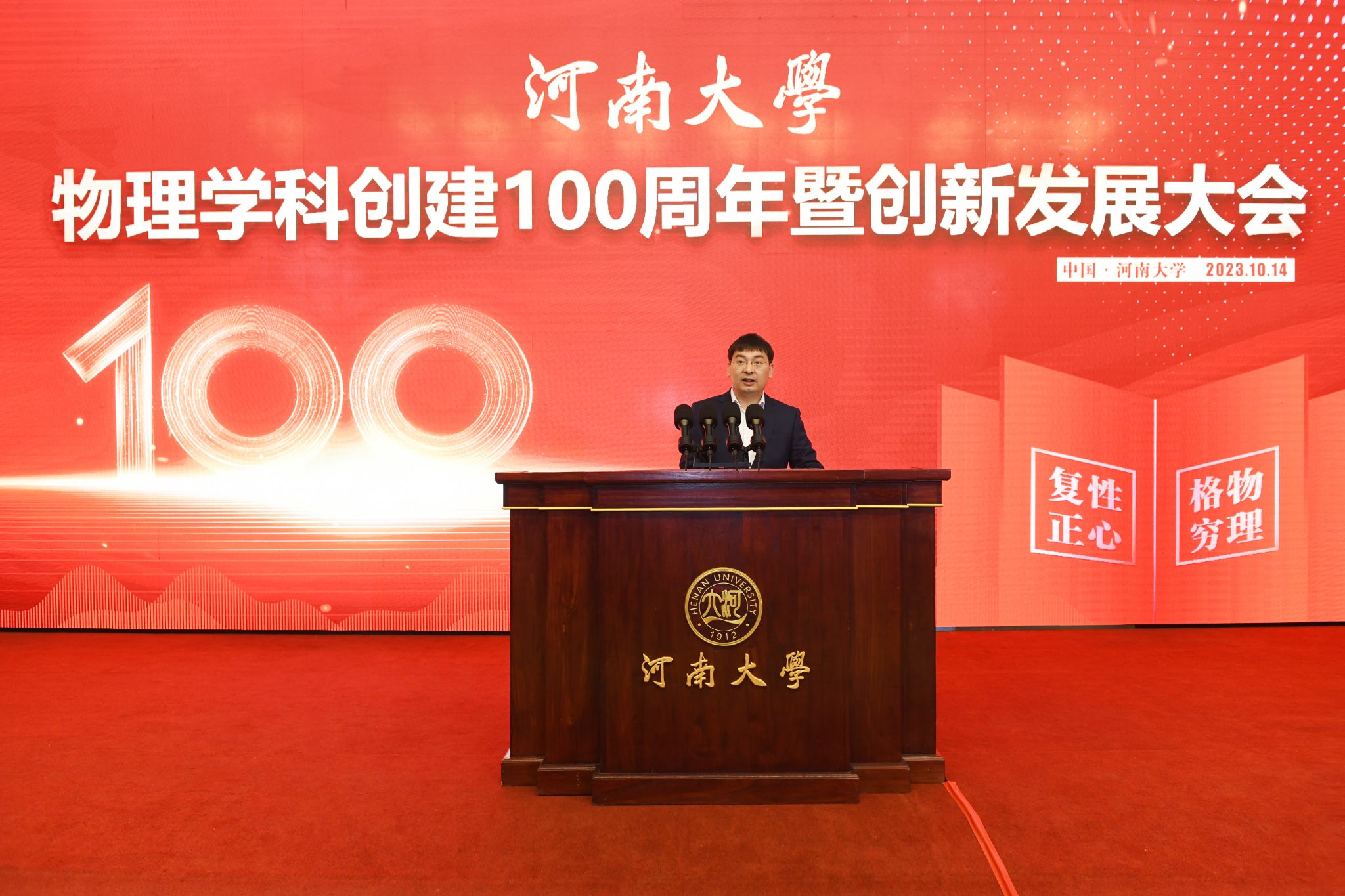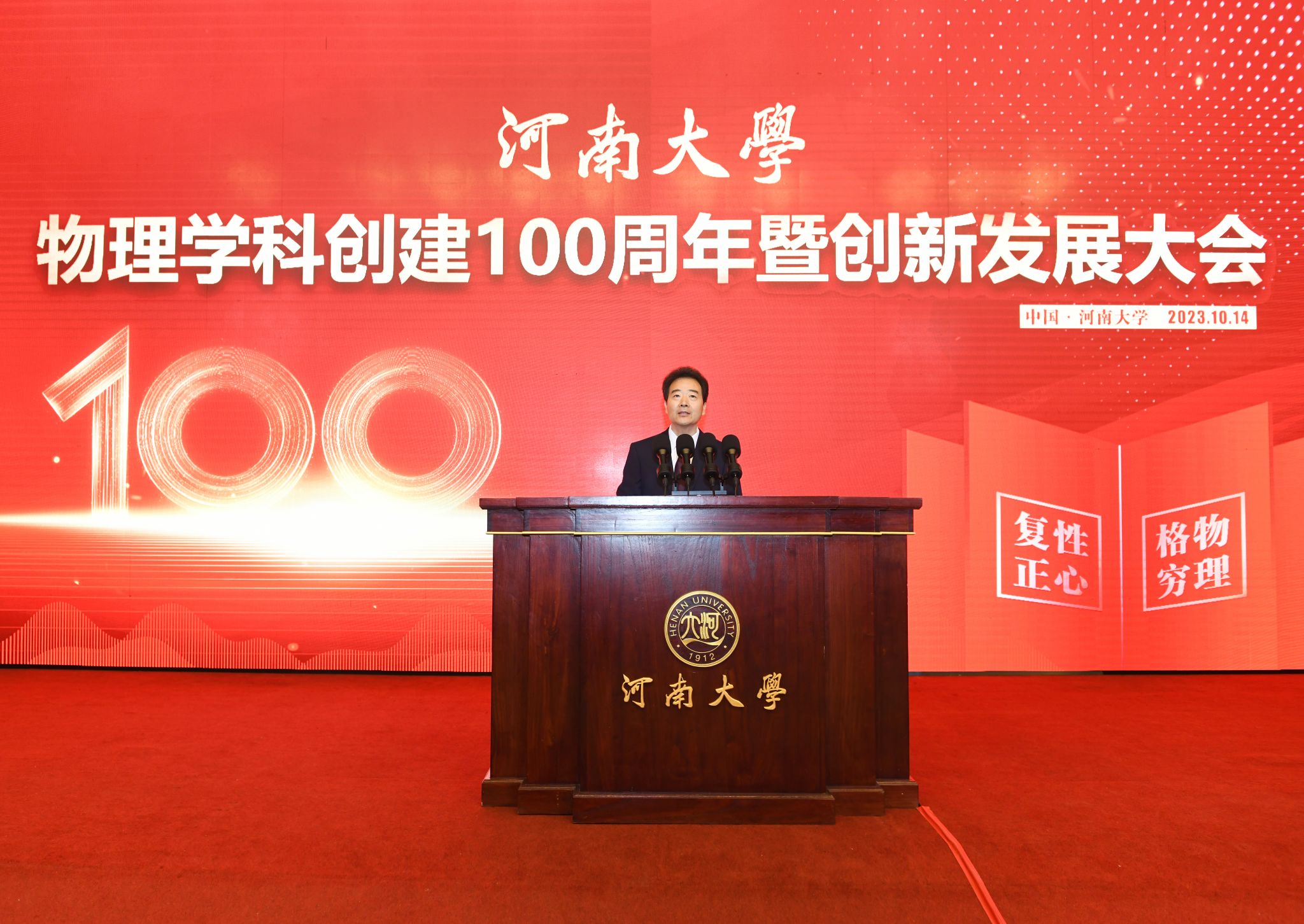 孙君健代表学校向与会嘉宾和广大校友表示衷心的感谢。他表示,一百年来,物理学科坚持以“建一流学科、育一流人才”为办学目标,为国家和河南省区域经济发展培养了一大批富有创新精神的高素质人才。一代代河大物理人在加强基础学科建设的同时,积极参与新兴、交叉学科建设,服务区域重大战略和学校发展。在学校建设“双一流”“双航母”的关键时期,在物理学科迎来创建100周年的重要时刻,我们面临前所未有的机遇和挑战。站在新的历史起点上,他提出四点期许:一是多措并举,为实现中华民族伟大复兴培养合格人才。二是凝心聚力,持续加强学科建设。三是引育并举,培优建强师资队伍。四是自强不息,传承弘扬河大精神。