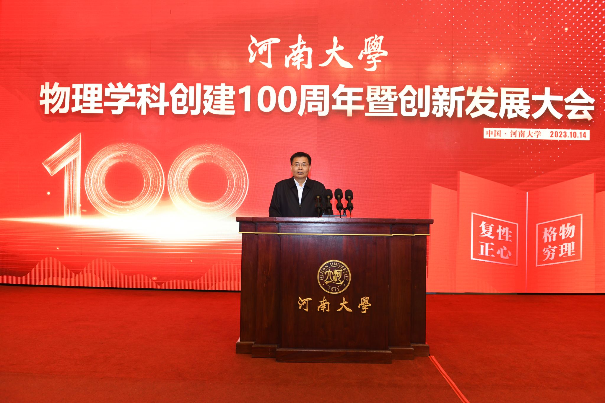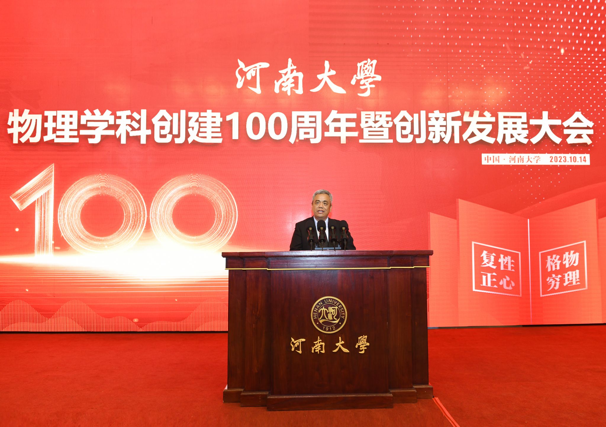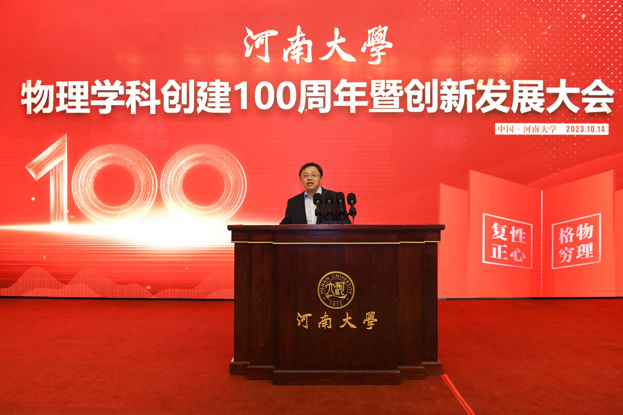 孙君健代表学校向与会嘉宾和广大校友表示衷心的感谢。他表示,一百年来,物理学科坚持以“建一流学科、育一流人才”为办学目标,为国家和河南省区域经济发展培养了一大批富有创新精神的高素质人才。一代代河大物理人在加强基础学科建设的同时,积极参与新兴、交叉学科建设,服务区域重大战略和学校发展。在学校建设“双一流”“双航母”的关键时期,在物理学科迎来创建100周年的重要时刻,我们面临前所未有的机遇和挑战。站在新的历史起点上,他提出四点期许:一是多措并举,为实现中华民族伟大复兴培养合格人才。二是凝心聚力,持续加强学科建设。三是引育并举,培优建强师资队伍。四是自强不息,传承弘扬河大精神。