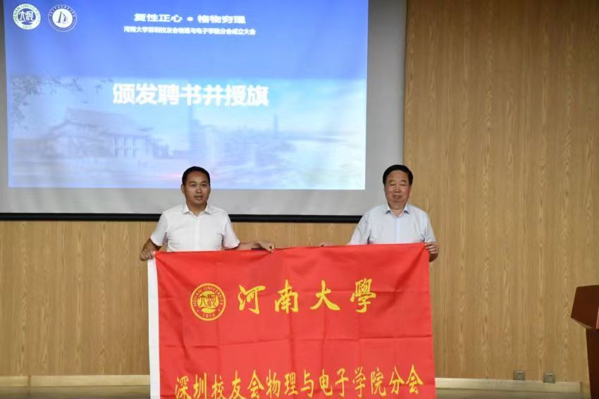 许绍康为bellbet贝博艾弗森官方网站深圳校友会bellbet贝博艾弗森官方网站分会授旗,并为分会首届会长颁发聘书。刘会军、张慧共同为分会首届理事会人员颁发聘书。