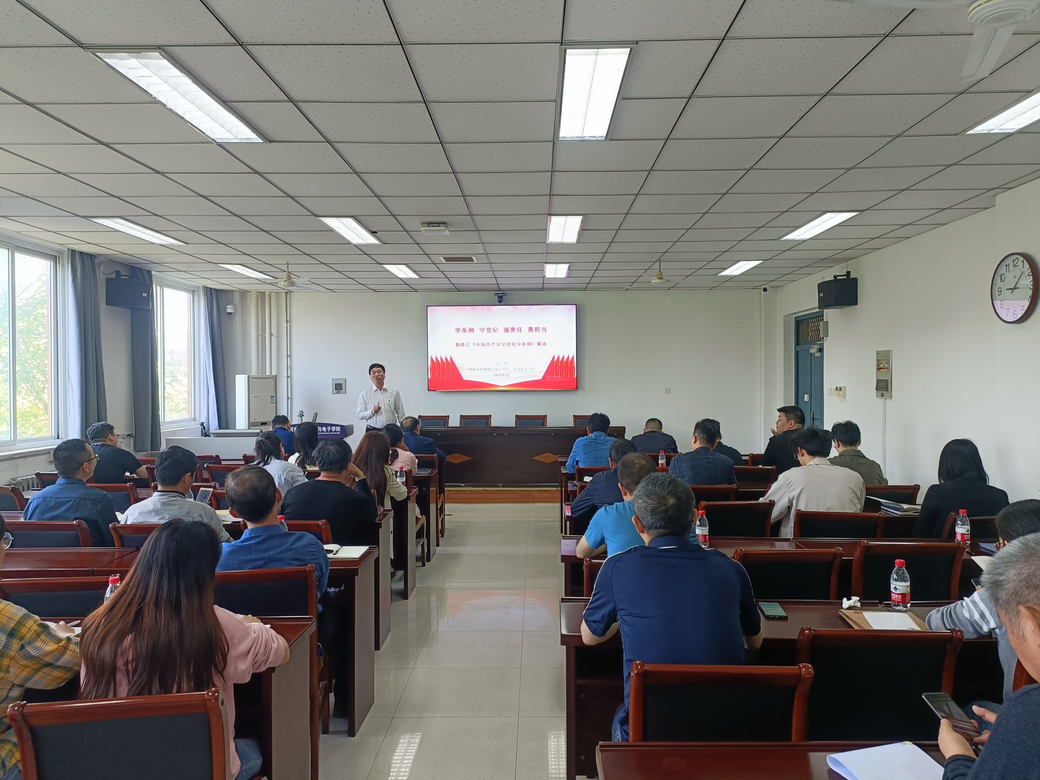 25日上午,两个学院班子全体副职、党支部书记、系室主任与师生党员代表在bellbet贝博艾弗森官方网站分别在B座304、A座313会议室,线上参加学校党纪学习教育专题读书班集体学习会议。下午,各党支部、系室分别组织开展了主题党日和自学,党员同志逐章逐条、通读精读《条例》全文,全面学习各项纪律规定、领悟主旨要义。