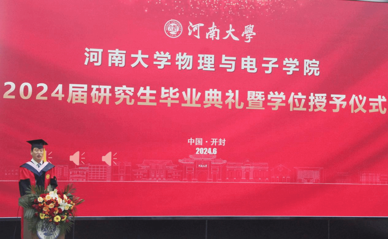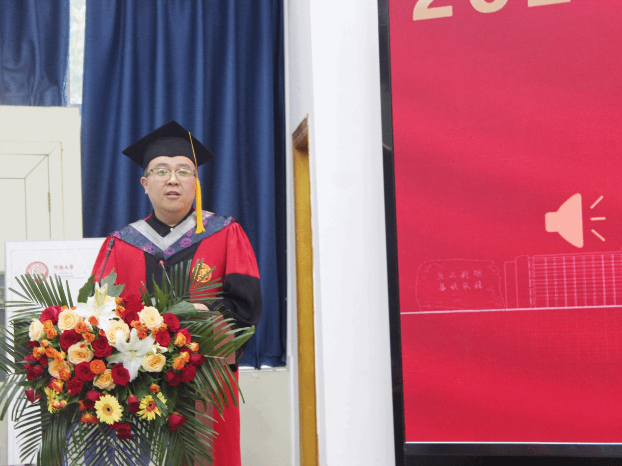 张慧向毕业生致以热烈的祝贺,向含辛茹苦养育同学们的父母家人、悉心教导同学们的师长致以崇高的敬意和诚挚的感谢!真诚寄语即将踏上新的人生征程的同学们:不忘初心、牢记使命,厚植“有理想”的家国情怀;永攀高峰、勇立潮头,争做“敢担当”的时代先锋;敬业励学、敢为人先,擦亮“能吃苦”的青春底色;自信拼搏、卓越创新,书写“肯奋斗”的精彩人生。“奋楫出发,筑梦新篇”,企盼踌躇满志,即将扬帆远航的同学们勿忘河大、勿忘物院,常回家看看!
