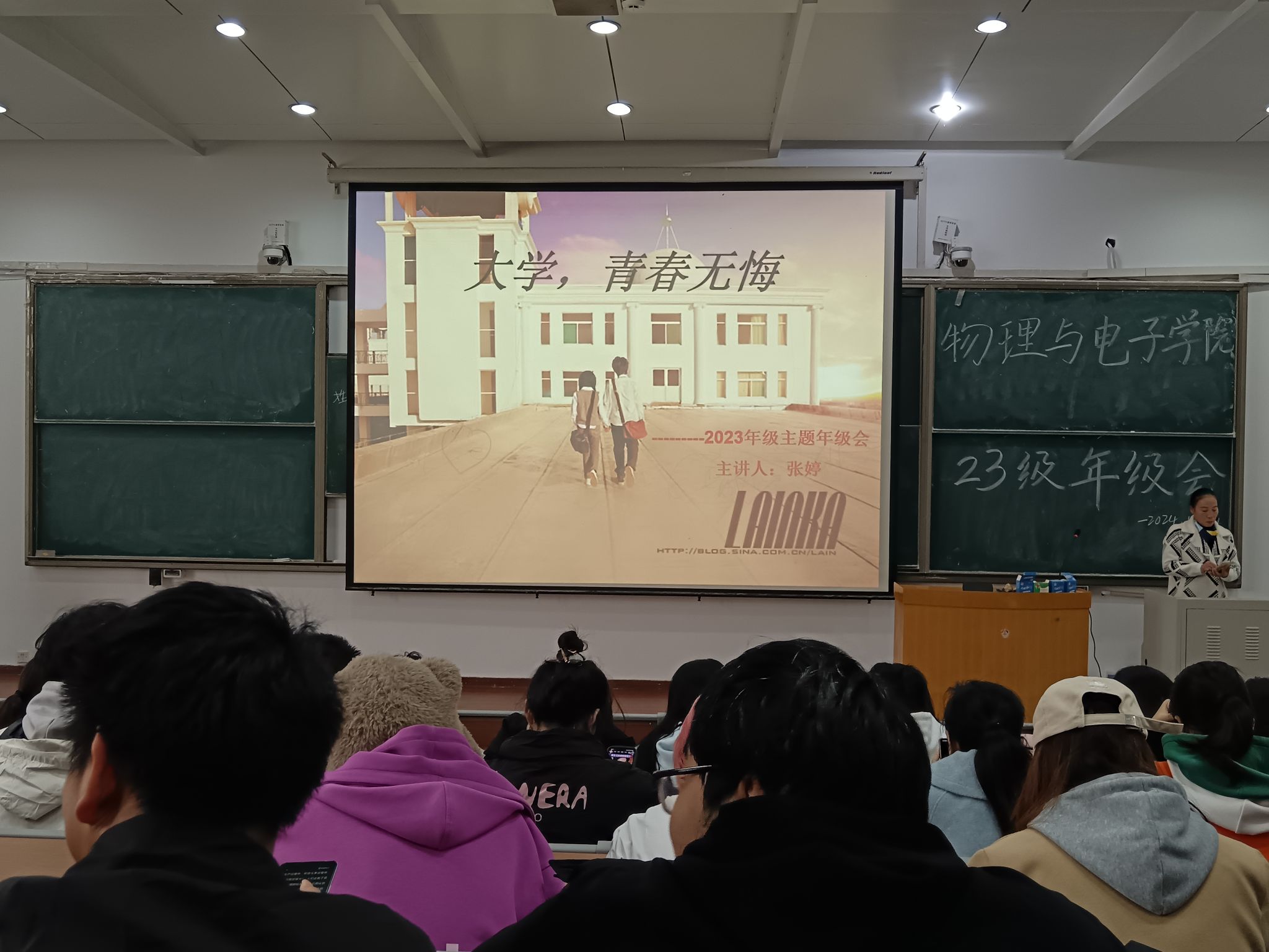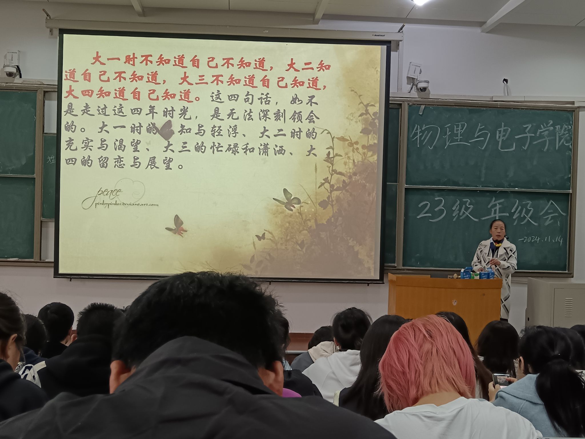 2024年11月14日下午,bellbet贝博艾弗森官方网站在金明校区综合楼2306教室召开2023级本科生年级会。张婷老师主持会议并围绕“大学,青春无悔!”这一主题,从班级建设、心理健康教育、人生规划以及当前目标设定等多个方面展开讲解。