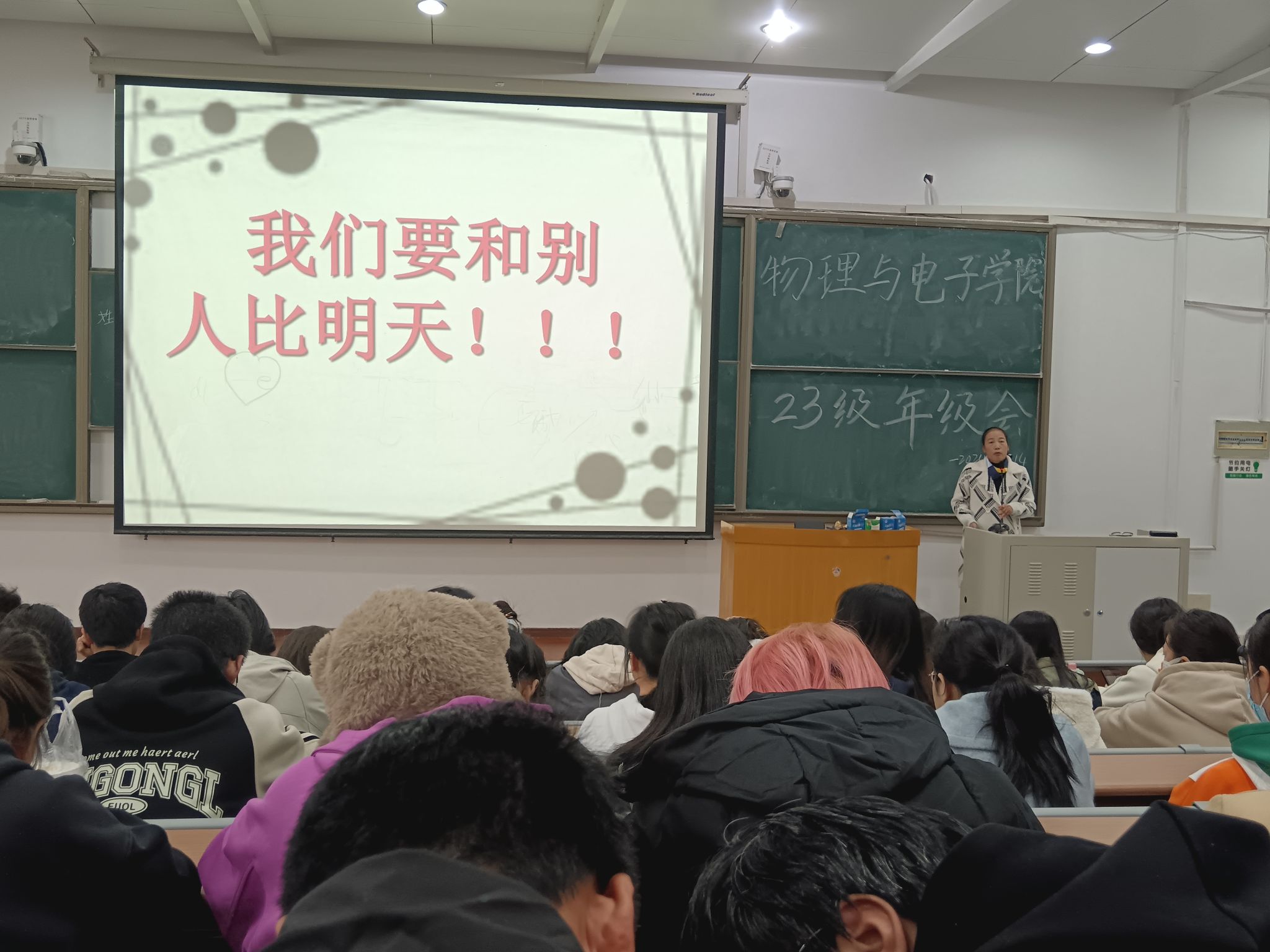 会议最后,张婷分析了当前严峻的就业压力和激烈的竞争环境,特别是随着大学招生标准和企业招聘标准的提高使得竞争变得更加残酷,同学们只有通过坚持不懈努力进一步提升自己的专业水平和综合素质,才能走在激烈的竞争中脱颖而出,创造出属于自己的辉煌成就。